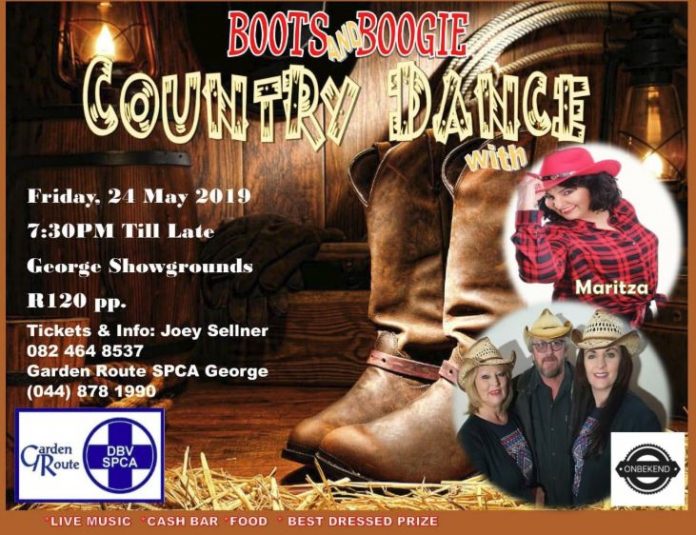 NewsLocal NewsBoots and Boogie Country DanceBy Herman Pienaar - May 11, 201901115FacebookTwitterPinterestWhatsApp Friday, 24 May 2019 George Showgrounds R 120 pp Tickets and info: Joey Cell: 0824648537 Garden Route SPCA 044 – 878 1990