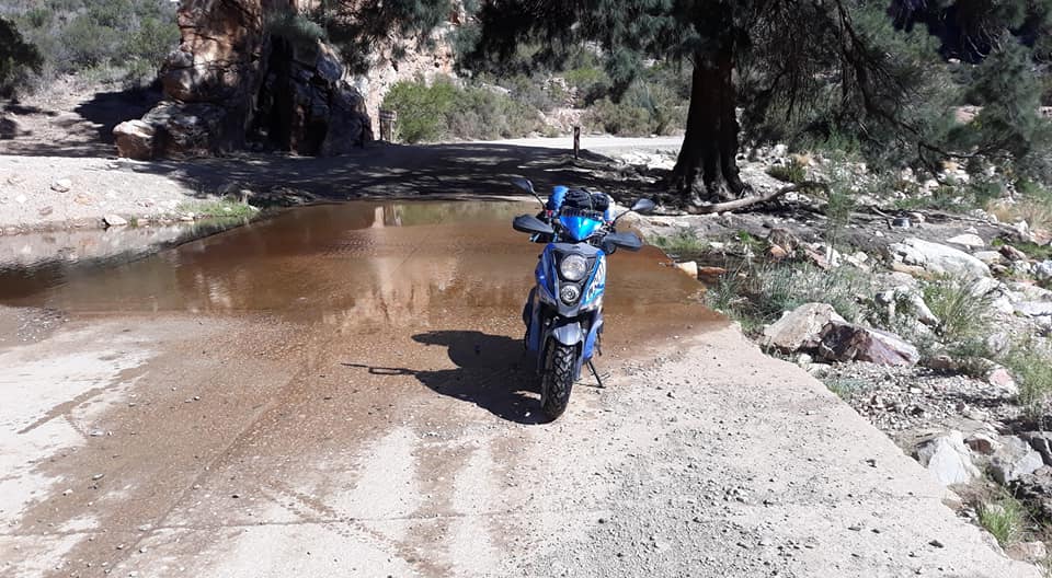Volgens Christo het die SYM CROX die pad besonder goed gehanteer. Jy pas net jou ry-styl en spoed aan by die fiets en die toestande. En omdat jy rustiger ry, is jy nie haastig nie, rus beter en sien meer. Ook, omdat die fiets so lig is (112kg) en die op- en afklim so maklik, stop jy makliker om die omgewing te verken of om ‘n foto te neem. Dis nie ‘n geklouter en gesukkel met ‘n swaar fiets nie.