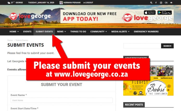 Please go to our website at www.lovegeorge.co.za and list your events. It can be any event in the Garden Route. Sport events, flea markets, church events, school events, arts – anything.